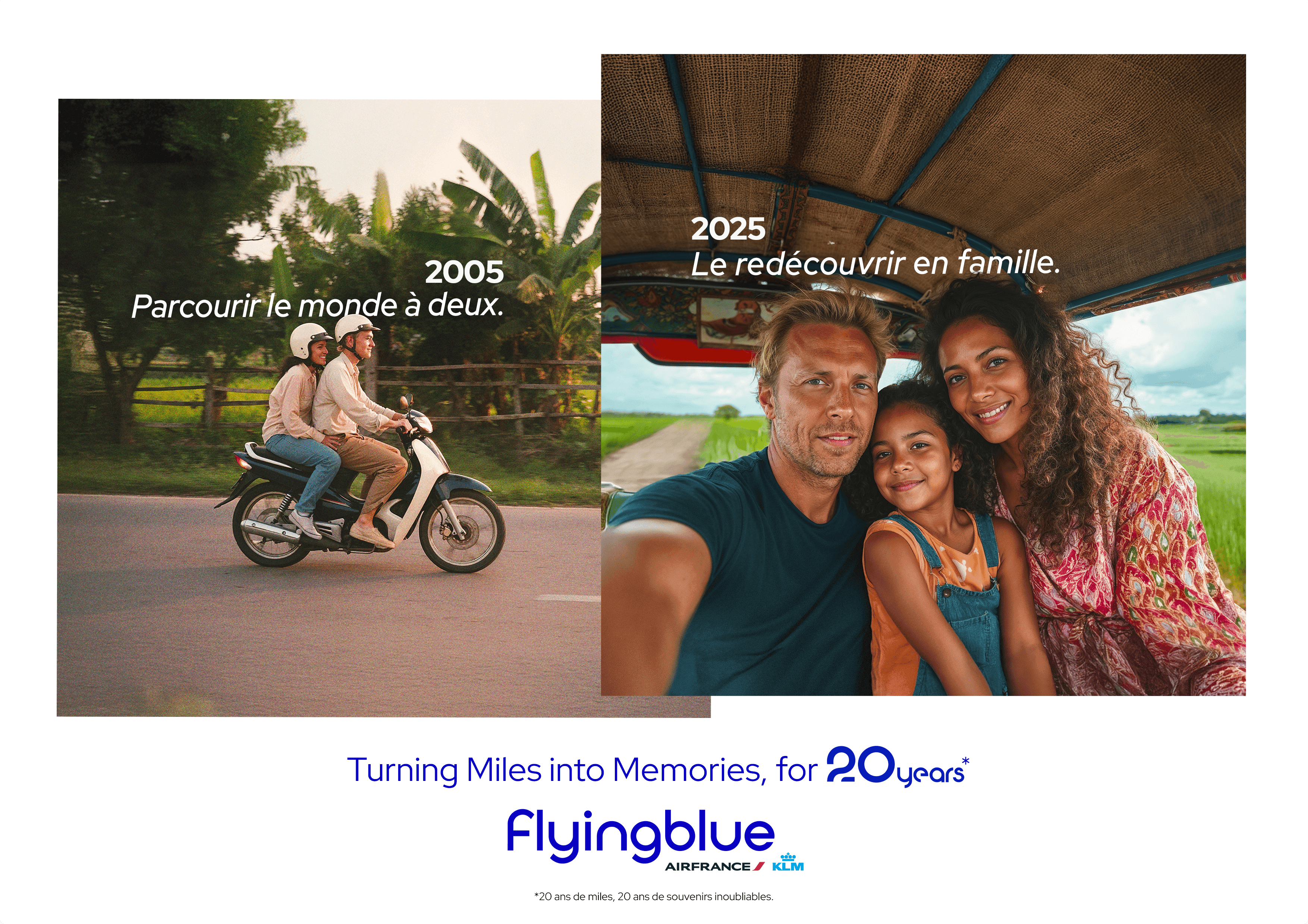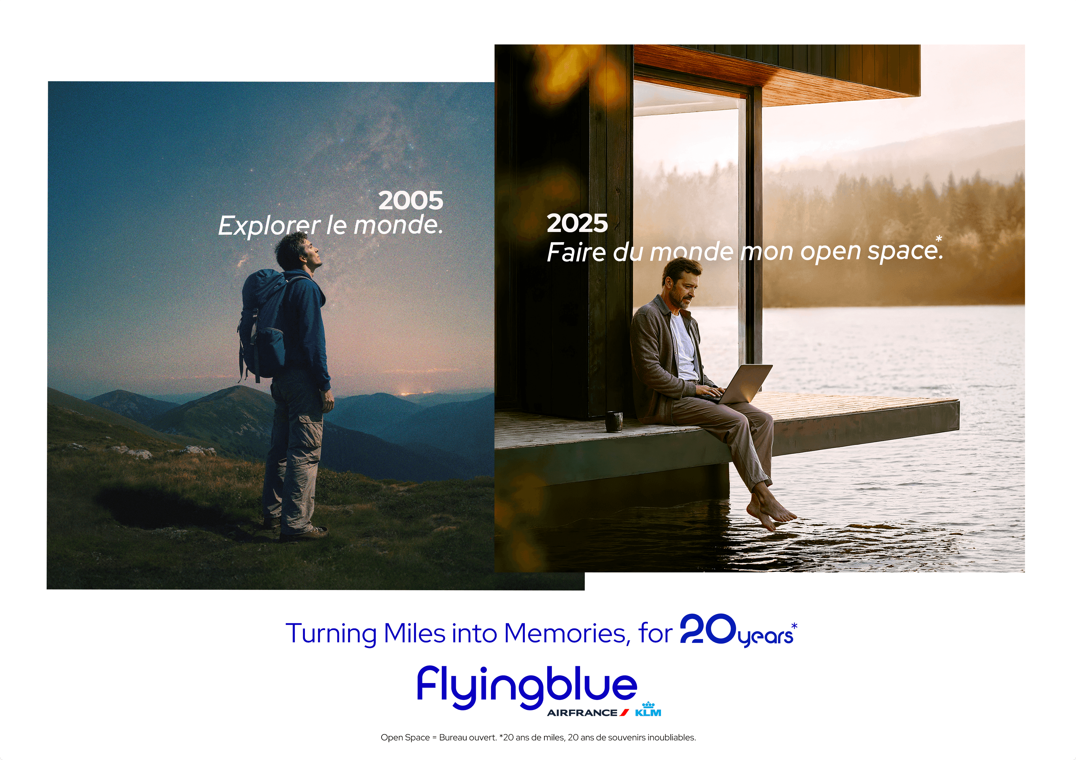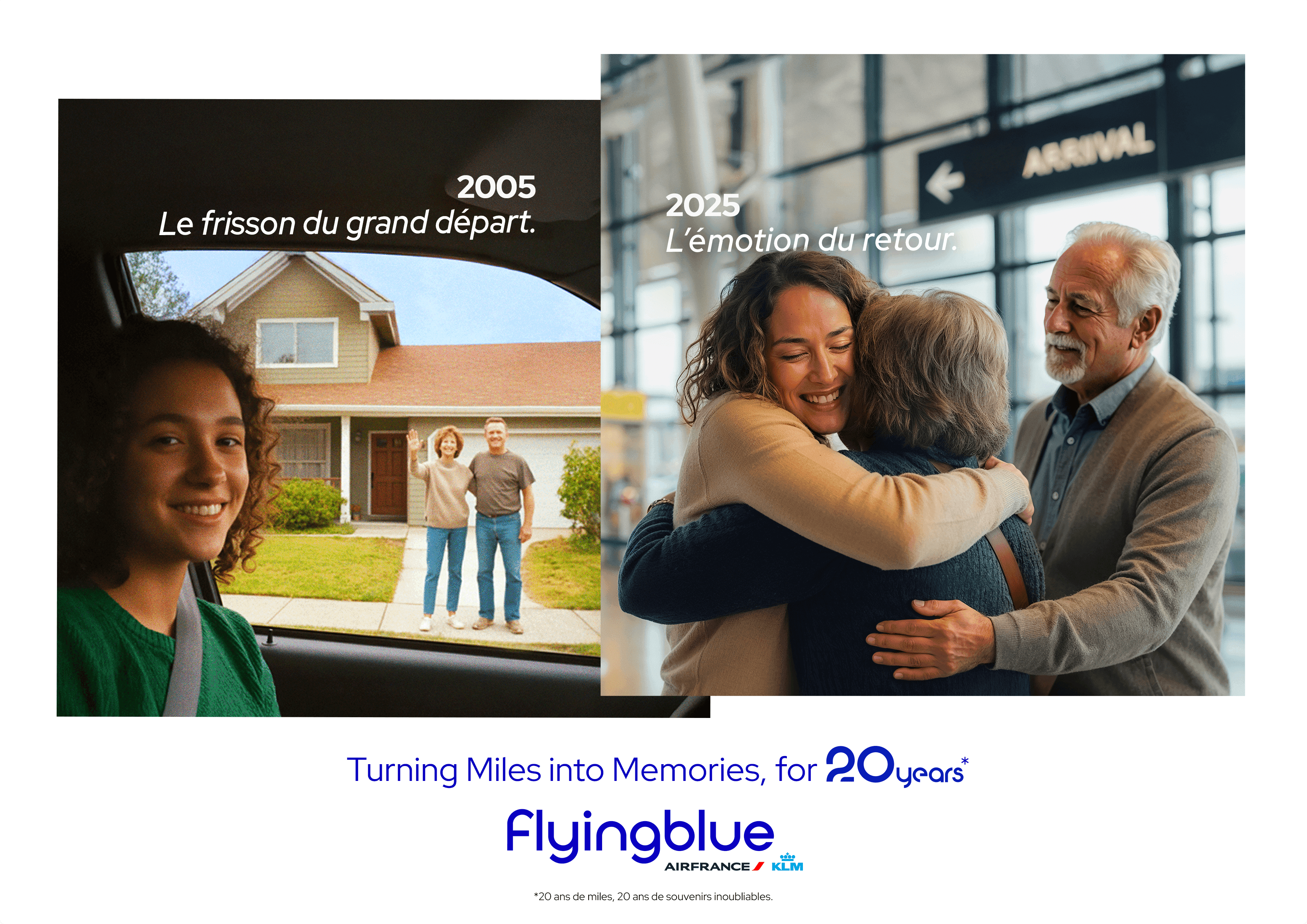 "In 2025, Flying Blue celebrates two decades of shared stories with its members. On this occasion, an innovative and international campaign created by its agency Starlings (which brings together three Publicis France entities: Epsilon France, Performics, and Marcel) will be launched starting in June. Centered around the tagline “Turning Miles into Memories, for 20 years”, this campaign is a true tribute to the millions of travel experiences made memorable thanks to the program."