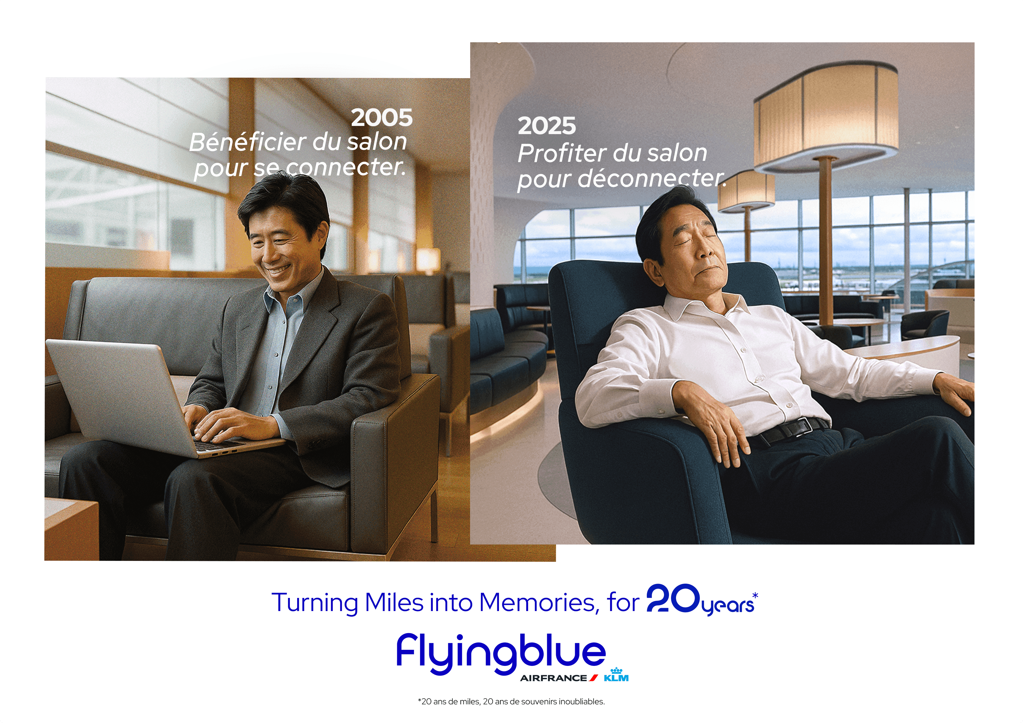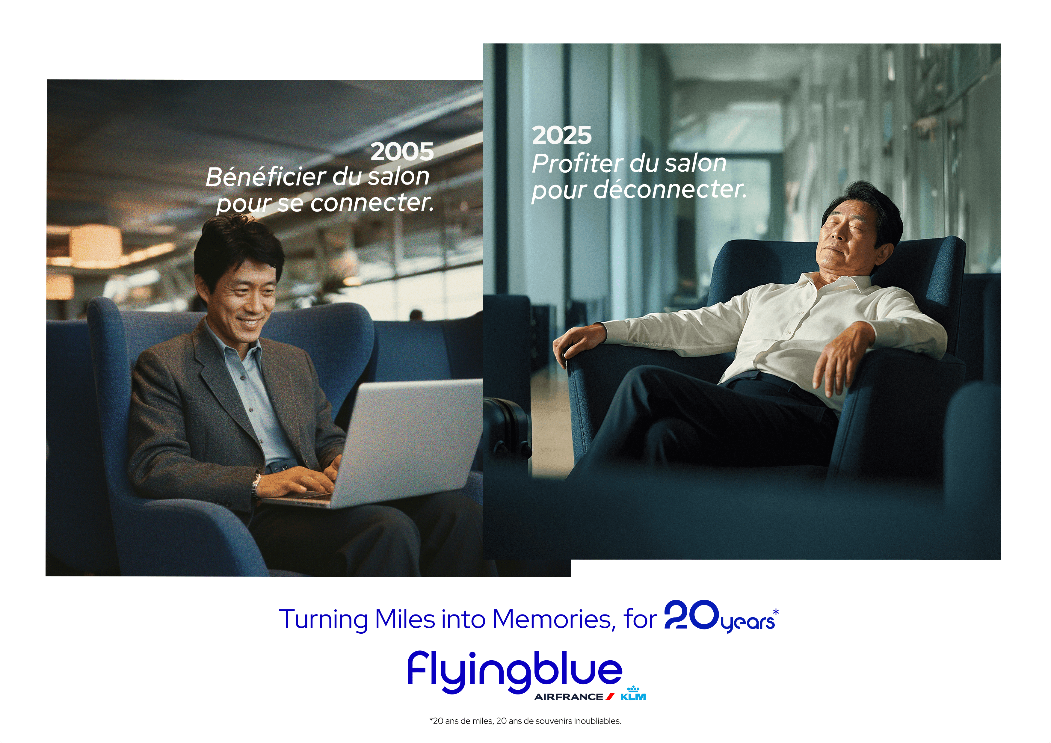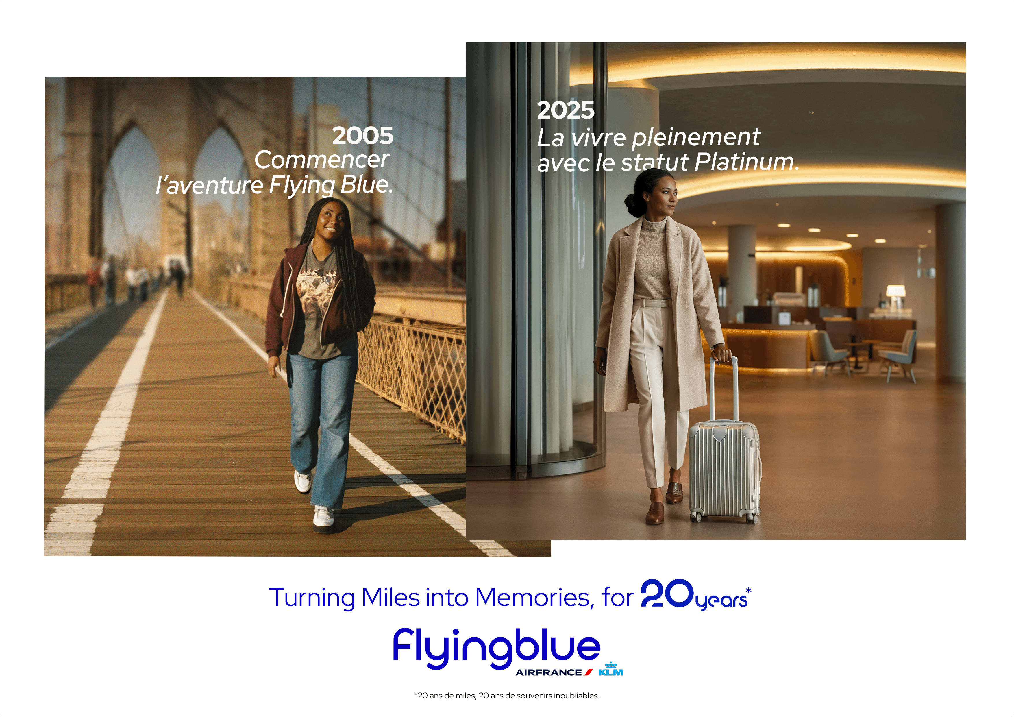 "In 2025, Flying Blue celebrates two decades of shared stories with its members. On this occasion, an innovative and international campaign created by its agency Starlings (which brings together three Publicis France entities: Epsilon France, Performics, and Marcel) will be launched starting in June. Centered around the tagline “Turning Miles into Memories, for 20 years”, this campaign is a true tribute to the millions of travel experiences made memorable thanks to the program."